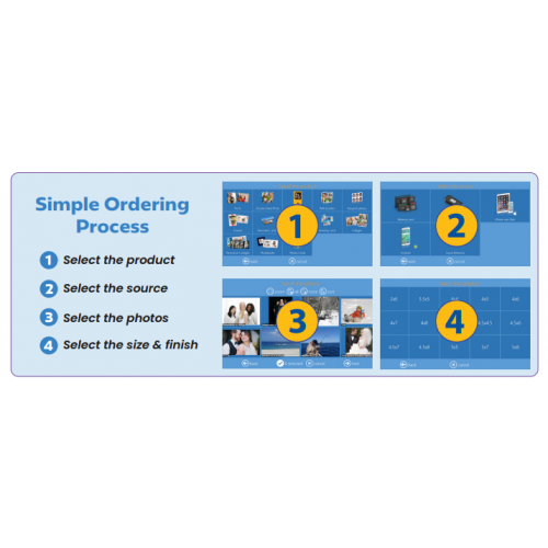 The durable 11.6” high-resolution touchscreen makes photo ordering simple and fun. Customers can connect via Wi-Fi, USB, SD card, or smartphone—even straight from social media and cloud accounts.