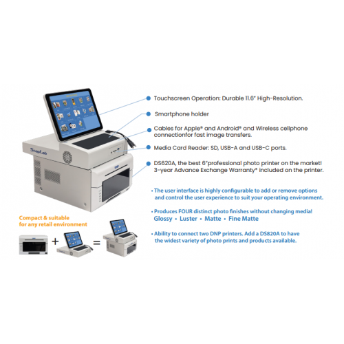 Bring professional-grade photo printing to any space with the DNP SnapLab II. Designed for retail, event, and hospitality environments, this all-in-one kiosk delivers high-quality prints, fast performance, and easy operation in a compact footprint. The SnapLab SL620AII is our newest compact kiosk system, combining a DS620A printer, an order terminal called a DS-Tmini, and DiLand software -- no computer needed! Our dye-sublimation compact kiosk system is the easy winning formula to turbo charge your photo business now!